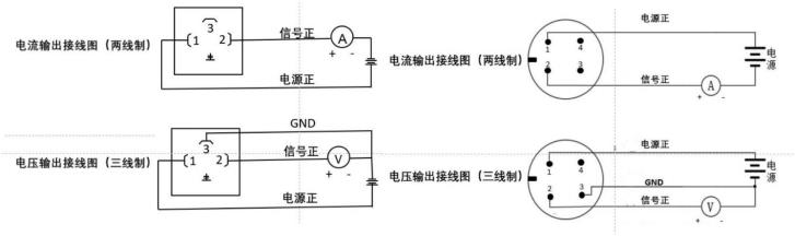 有外部引线时: 电流型 :红色线 V+ 、蓝 OUT+; 电压型 :红色线 V+ 、蓝 OUT+ 、黄 GND;